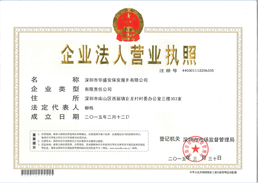 深圳市华盛安保安服务有限公司成立于2015年2月,注册资金700万,是一家专业从事门卫、巡逻、守护、随身护卫、安全检查、秩序维护的安保企业,成立以来公司获得广东省公安厅颁发的《保安服务许可证》并顺利获得ISO9001:2008 ISO14001:2004 OHSA18001:2007等三项管理体系国际认证;经政府采购部门批准,公司现为深圳市采购保安服务注册供应商。
